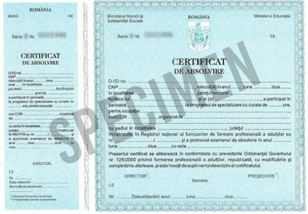 La absolvirea cursului, în urma promovarii examenului, absolvenții primesc următoarele documente:
